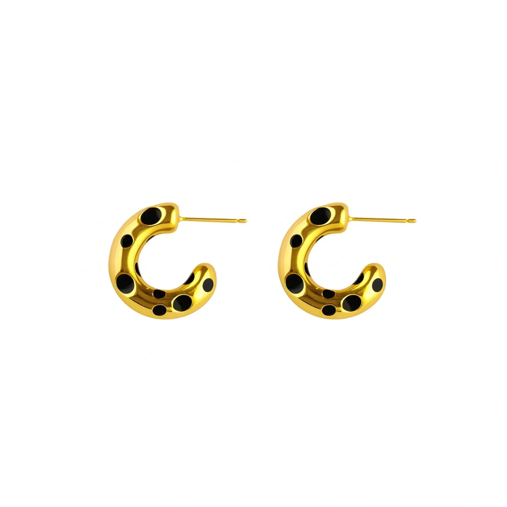 Minimalistas pero atrevidos. Estos aretes tipo argolla con diseño curvo y detalles en puntos negros crean un contraste visual moderno y divertido, perfectos para destacar cualquier look. Disponible en dos versiones: dorado y plateado. Ideal para quienes aman los accesorios con un toque de originalidad sin perder la elegancia.