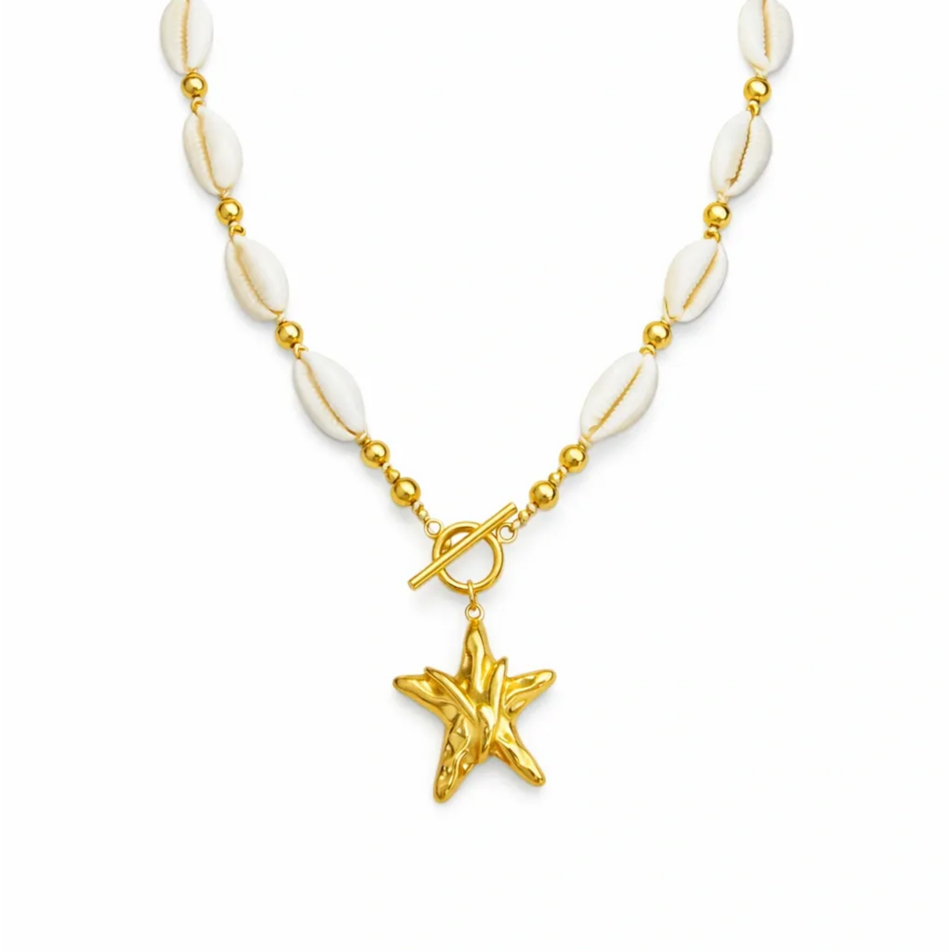 Un collar que captura el espíritu del mar con conchas naturales y un dije dorado de estrella de mar. El broche tipo toggle en el centro aporta un toque moderno y práctico para lucirlo al frente. Ideal para llevar en vacaciones o como un detalle costero en tu día a día.
