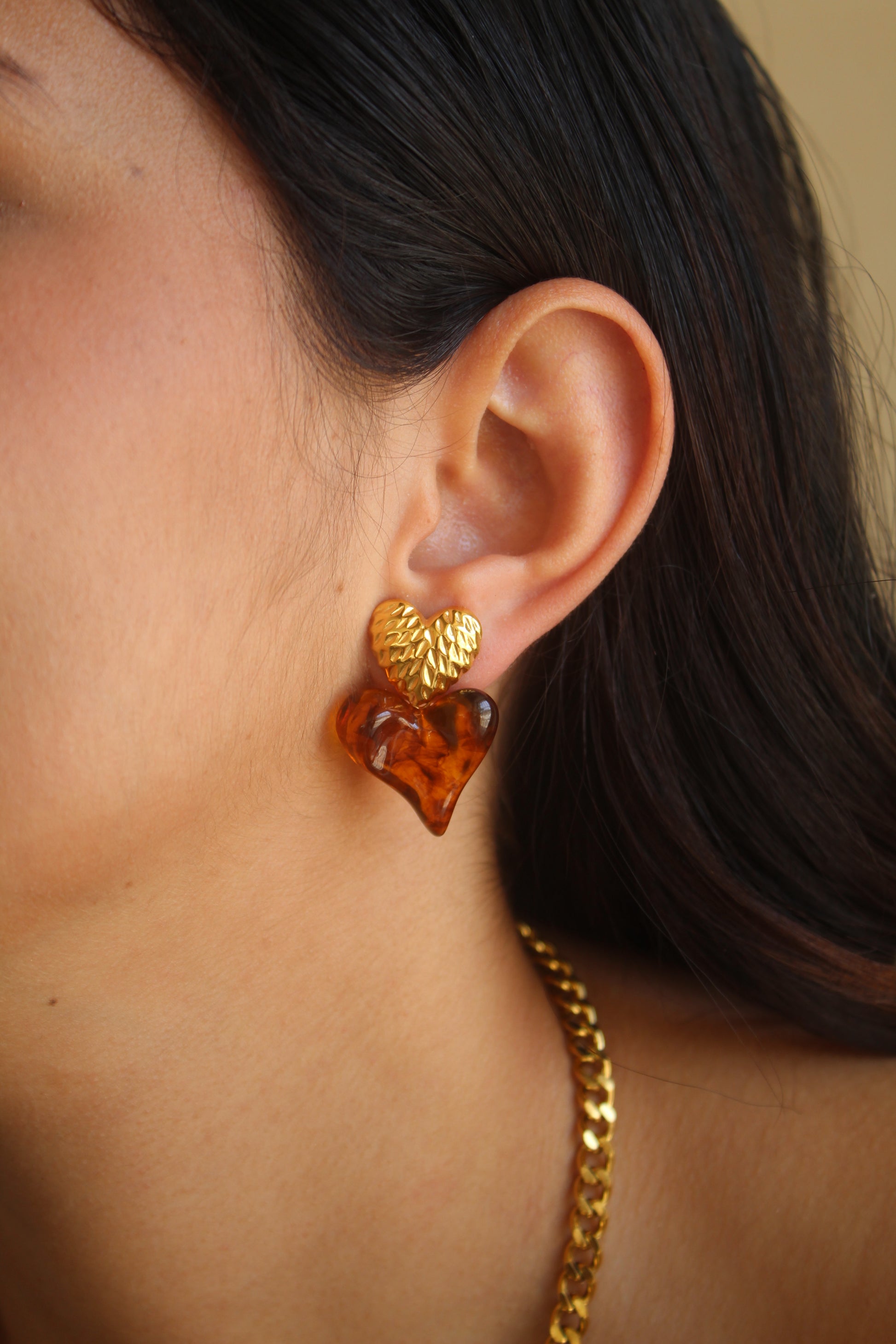 Una fusión encantadora entre textura y calidez. Estos aretes presentan un corazón superior con acabado martillado en dorado, complementado por un corazón colgante en tono ámbar traslúcido, creando un contraste que capta la luz con delicadeza. Perfectos para quienes buscan un toque romántico y moderno a la vez.