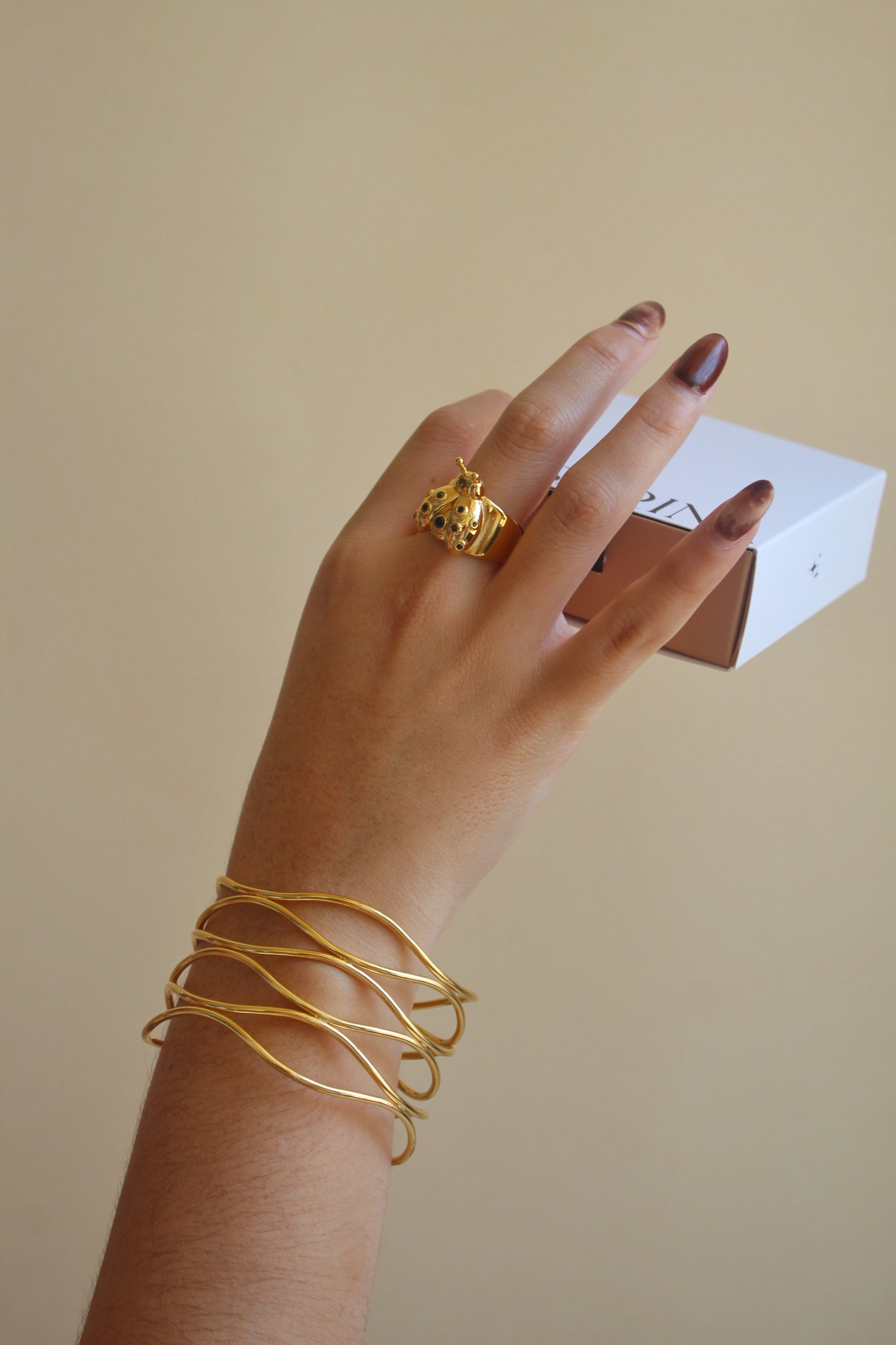Una pieza llamativa y original con forma de mariquita en relieve, elaborada en dorado intenso con detalles en esmalte negro. Este anillo abierto simboliza la buena suerte y es perfecto para quienes aman los accesorios únicos con personalidad.