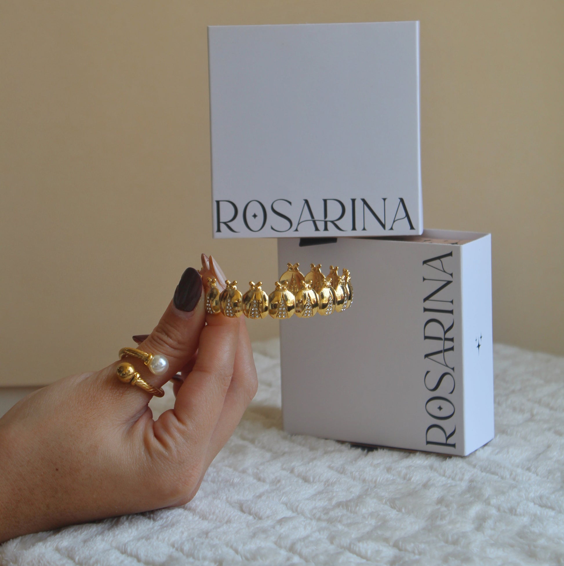 Una pieza fascinante que fusiona arte y diseño en cada detalle. Su silueta envolvente está decorada con delicadas formas de escarabajo en baño dorado brillante, con incrustaciones de microcristales que aportan textura, luz y sofisticación. Ideal para destacar en cualquier ocasión.